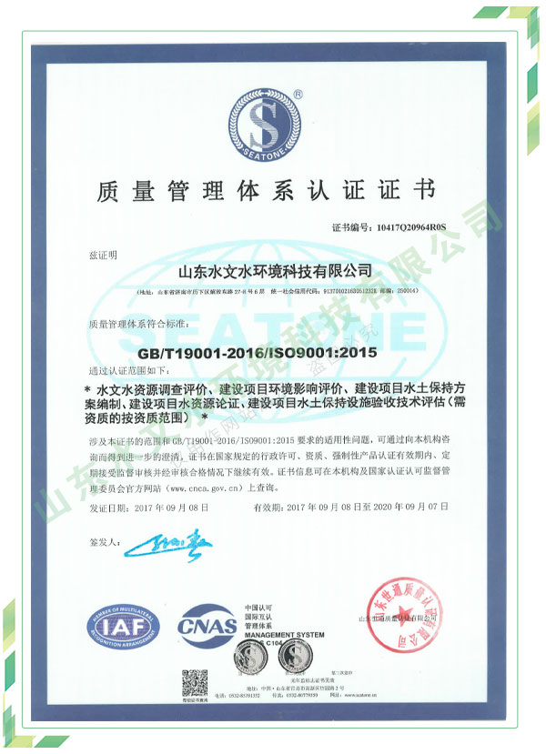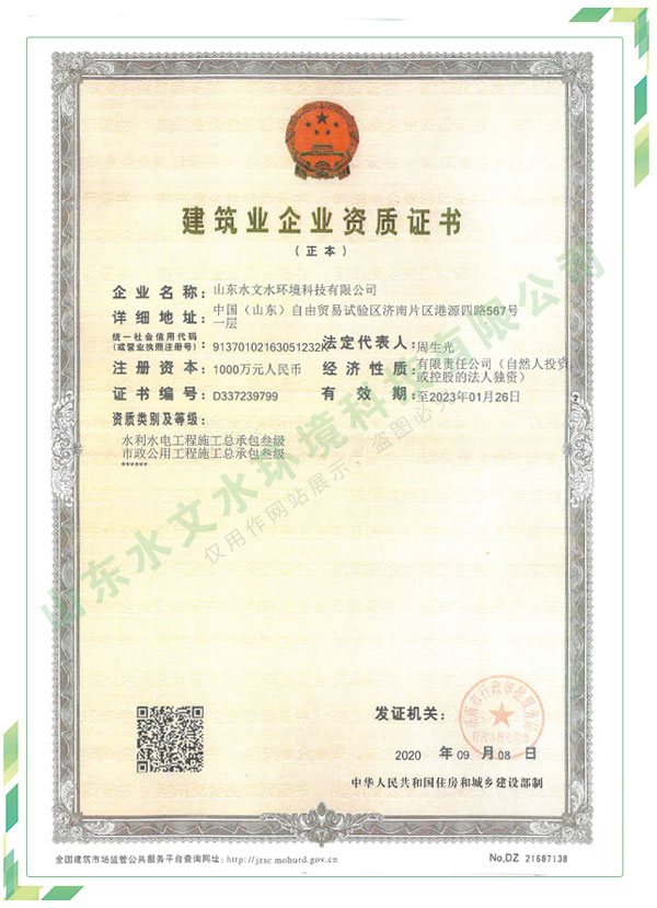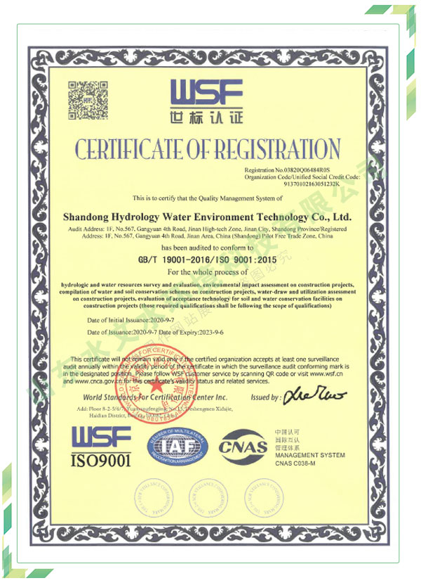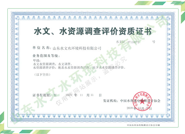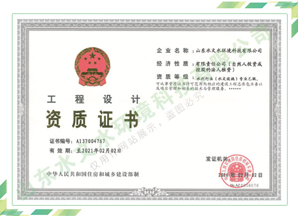 公司擁有水利工程設(shè)計、水土保持、水文水資源調(diào)查評價、水資源論證、建設(shè)項(xiàng)目環(huán)境影響評價、市政公用工程施工總承包、水利水電工程施工總承包、電子與智能化工程專業(yè)承包等資質(zhì),2017年通過質(zhì)量管理體系、環(huán)境管理體系、職業(yè)健康安全管理體系認(rèn)證;2020年被評為國家級高新技術(shù)企業(yè),同年被中國水利企業(yè)協(xié)會推薦為第一批“合同節(jié)水服務(wù)企業(yè)”;2021年被山東省、濟(jì)南市評為 “專精特新”中小企業(yè)。業(yè)務(wù)范圍涉及水利工程設(shè)計;節(jié)水設(shè)計、改造、水平衡測試;山洪災(zāi)害調(diào)查;城市水資源調(diào)查評價;建設(shè)項(xiàng)目水土保持方案編制、監(jiān)測、驗(yàn)收、水土保持規(guī)劃;水安全保障規(guī)劃、建設(shè)項(xiàng)目水資源論證、規(guī)劃水資源論證;建設(shè)項(xiàng)目環(huán)境影響評價;入河排污口論證;防洪影響評價;市政公用工程施工、水利水電工程施工、電子與智能化工程施工等。
